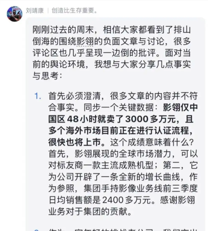 12月8日晚,影石“90后”创始人刘靖康向全体员工发出公开信,正面回应相关质疑。他首先对销量传闻进行了澄清:“影翎仅中国区48小时就卖了3000多万元,且多个海外市场目前正在进行认证流程,很快也将上市。”在刘靖康看来,影翎为影石开辟了一条新的增长曲线。