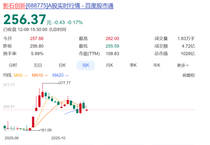 截至12月9日收盘,影石创新股价报收256.37元,较9月初的高点377.77元已跌超30%,但仍较半年前刚上市时涨超440%,总市值1028亿元,